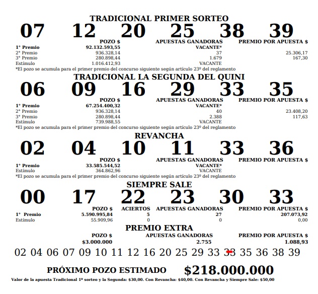 Durante el sorteo de anoche no se registraron ganadores con 6 aciertos quedando la totalidad de los pozos vacantes, sumando un estimado de 218 millones de pesos para el próximo sorteo.