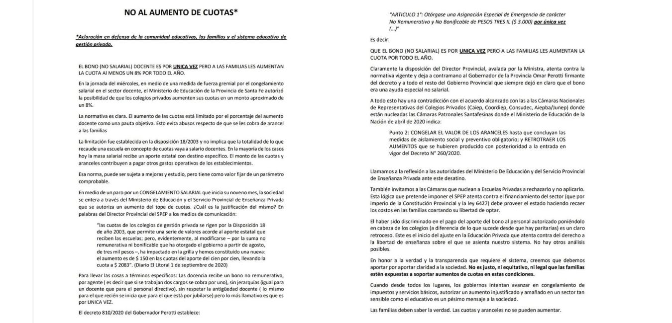 “No al aumento de cuotas”, arranca el escrito firmado por el secretario general de Sadop Rosario, Martín Lucero, y su par de la seccional Santa Fe, Pedro Bayúgar. “En medio de una medida de fuerza gremial por el congelamiento salarial en el sector docente, el Ministerio de Educación de la Provincia autorizó la posibilidad de que los colegios privados aumenten sus cuotas en un monto aproximado de un 8 por ciento”, repudiaron.