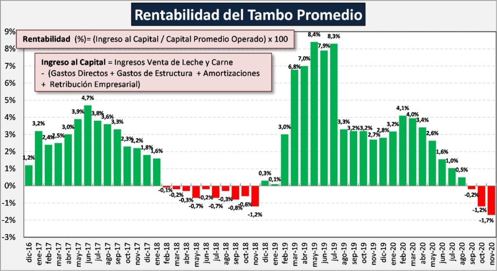 Los datos estadísticos muestran que el precio de la leche al productor para el mes de noviembre del 2020 fue de $ 20,37/litro (SIGLeA) y $ 20,73/litro (Panel 18 Empresas). El Costo de Producción (Gastos Directos + Gastos de Estructura + Amortizaciones + Retribución Empresarial – Recuperos) fue de $ 21,96.