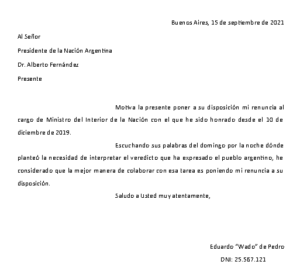 La carta de renuncia de Eduardo «Wado» de Pedro