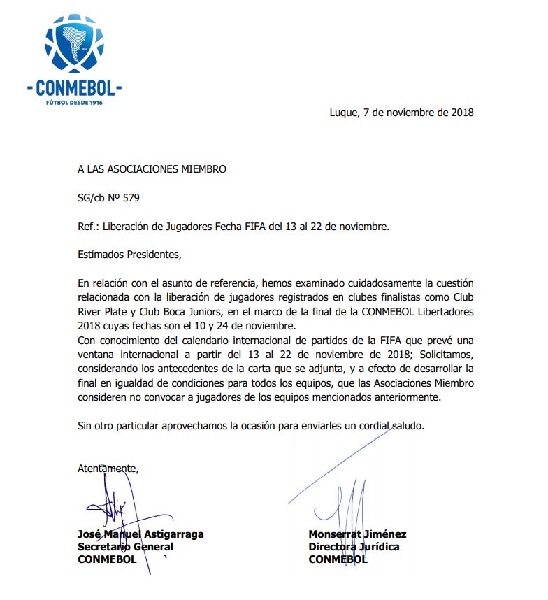 Este miércoles, la CONMEBOL solicitó que, durante la próxima fecha FIFA, las selecciones sudamericanas no convoquen jugadores de River y Boca, finalistas de la Libertadores 2018.