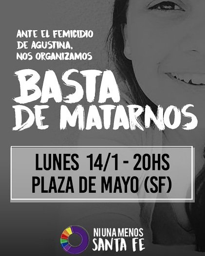 Luego de la conmoción en toda la provincia por el crimen de Agustina Imwilkelried, mujeres nucleadas en el colectivo “Se dice de mí” convocaron para esta noche a una manifestación en la Plaza San Martín de la ciudad de Esperanza. Además, se convoca a sumar el pedido de justicia en la ciudad de Santa Fe: será desde las 20hs, en la Plaza de Mayo.
