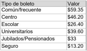 De esta manera, el valor del ticket común pasará de 42,35 pesos a 59,35 pesos. Mientras que, el Boleto Centro tendrá un valor de 46,20 pesos; el Escolar de 26,40 pesos; el Universitarios de 39,60 pesos; el Jubilados y Pensionados de 33 pesos; y el Seguro será de 13,20 pesos.