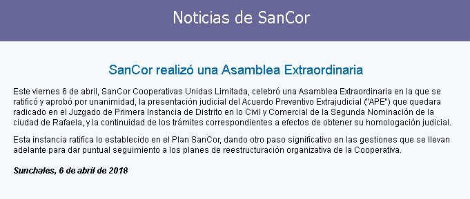 «Este viernes 6 de abril, SanCor Cooperativas Unidas Limitada, celebró una Asamblea Extraordinaria en la que se ratificó y aprobó por unanimidad, la presentación judicial del Acuerdo Preventivo Extrajudicial («APE»)», consignó en un comunicado.