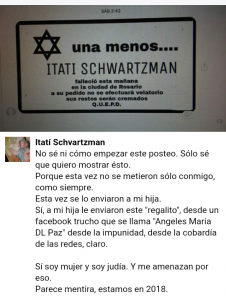 «No sé ni cómo empezar este posteo. Sólo sé que quiero mostrar ésto. Porque esta vez no se metieron sólo conmigo, como siempre. Esta vez se lo enviaron a mi hija. Sí, a mi hija le enviaron este regalito, desde un Facebook trucho que se llama Angeles Maria DL Paz desde la impunidad, desde la cobardía de las redes, claro», señaló la escritora Itatí Schvartzman.