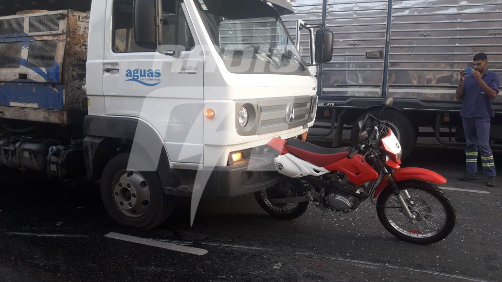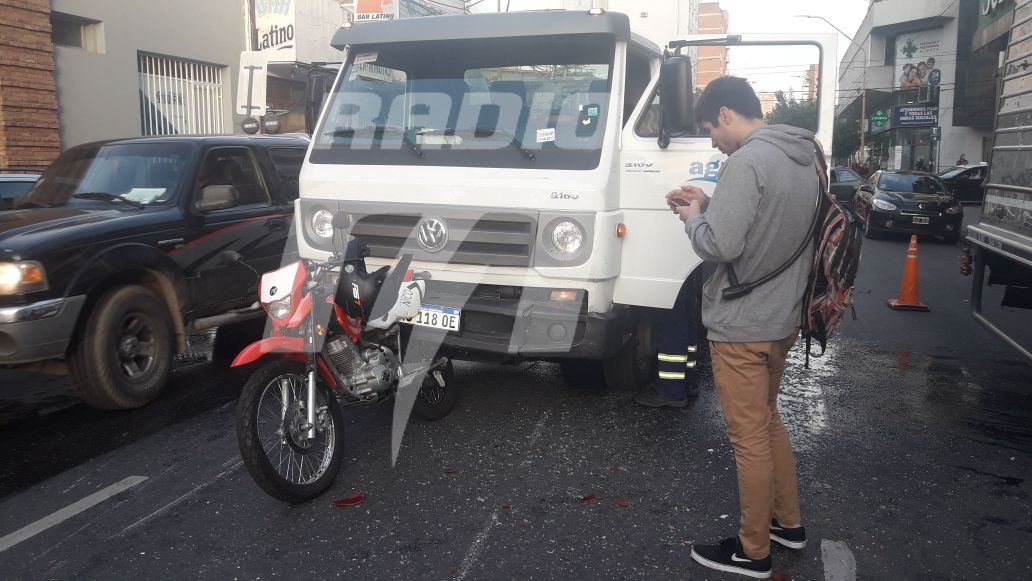 Un auto Ford Fiesta frenó de repente en el semáforo y una moto lo embistió de atrás. En tanto, un camión de Aguas Santafesinas no pudo frenar y colisionó con el motovehículo.