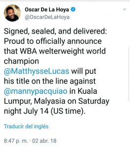 Pacquiao fue ganador de nueve títulos mundiales en ocho categorías en 23 años de carrera y posee un récord de 59-7-2 (38 por KO). El filipino viene de ser derrotado por Jeff Horn y perder el cinturón welter de la OMB. «No puedo esperar para desafiar a Matthysse», admitió el púgil zurdo de 39 años.