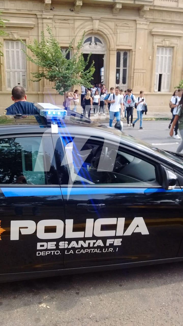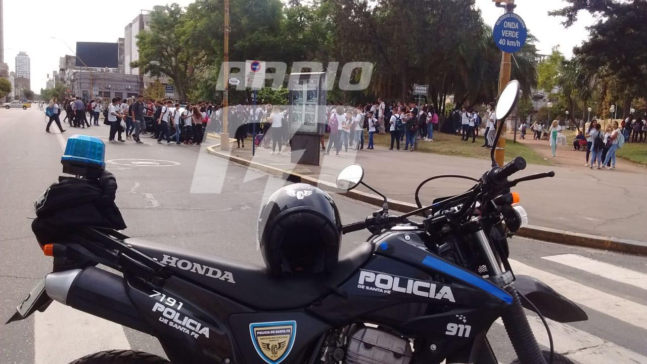 La policía con su Brigada de Explosivos llegó hasta la institución y realizó el procedimiento de protocolo, evacuando a los chicos en la Plaza España.