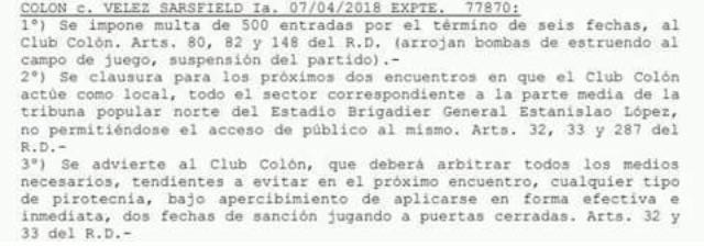 Por seis fechas Colón deberá pagar a AFA el monto equivalente a 500 entradas populares en concepto de multa económica. Además el sector medio de la tribuna popular norte seguirá vallado e inhabilitado por dos fechas de local. También hubo una advertencia, de suceder nuevamente lo mismo se clausurará el estadio por dos fechas consecutivas.