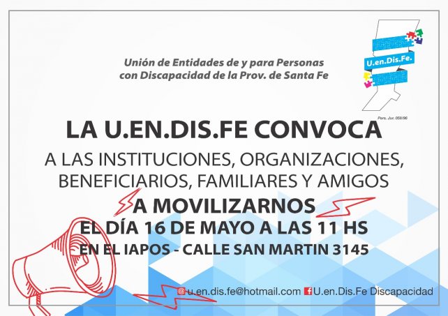 La Unión de Entidades de y para Personas con Discapacidad de la provincia de Santa Fe llevará adelante una concentración este miércoles frente a la sede de Iapos, ubicada en San Martín 3100. La movilización es en reclamo por el atraso de cinco meses que mantiene la obra social en el pago por servicios de atención a las personas con discapacidad.
