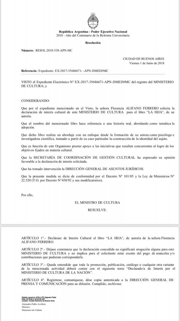 El pasado viernes 1 de junio por resolución 2018-538-APN-MC el Ministerio de Cultura de la Nación declara de interés cultural al libro “La hija” de autoría de Florencia Alifano Ferrero.