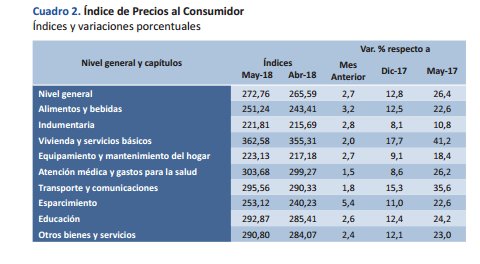 El IPC registró en Mayo de 2018 un aumento del 2,7% en relación al mes anterior.