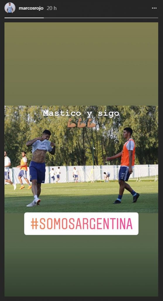 Rojo subió una foto suya mordiendo la remera, durante un entrenamiento con la selección en Broonitsy, y escribió «mastico y sigo». Además, agregó tres emojis de «fuerza» y el hashtag #somosargentina.