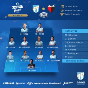 Atlético Tucumán: 1- Cristian Luchetti/ 20- José San Román, 31- Yonathan Cabral, 39- Andrés Lamas y 16- Mathias Abero/ 38- Nery Leyes y 29- Rodrigo Aliendro/ 19- David Barbona, 10- Gervasio Núñez y 28- Tomás Cuello/ 18- Mauro Matos. DT: Ricardo Zielinski.