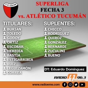 Colón: 1-Leonardo Burián/ 2- Gustavo Toledo, 27- Erik Godoy, 24- Guillermo Ortíz y 31- Gonzalo Escobar/ 21- Leonardo Heredia, 14- Adrián Bastía y 28- Marcelo Estigarribia/ 10- Alan Ruiz/ 9- Nicolás Leguizamón y 11- Javier Correa. DT: Eduardo Domínguez.