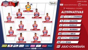 Junior: 1- Sebastián Viera/ 20- Marlon Piedrahíta, 5- Rafael Pérez, 25- Willer Ditta y 2- Germán Gutiérrez/ 7- Sebastián Hernández, 6- James Sánchez, 14- Leonardo Pico y 10- Jarlan Barrera/ 18- Yoni González y 23- Luis Díaz. DT: Julio Comesaña.