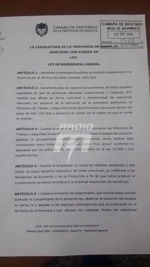 La Ley de Emergencia Laboral, de ser aprobada, sería por 180 días y servirá ante cualquier decisión de despidos que tome una empresa. Augsburger explicó que «el Ministerio de Trabajo debe convocar a una audiencia de parte para retrotraer la medida y en caso de incumplimientos aplicar sanciones».