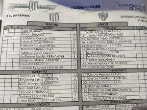 Unión: 1- Nereo Fernández/ 4- Damián Martínez, 28- Yeimar Gómez Andrade, 33- Jonathan Botinelli y 14- Bruno Pittón/ 11- Diego Zabala, 5- Nelson Acevedo, 23- Manuel De Iriondo, 30- Mauro Pittón y 7- Franco Fragapane/ 27- Franco Soldano. DT: Leonardo Madelón.