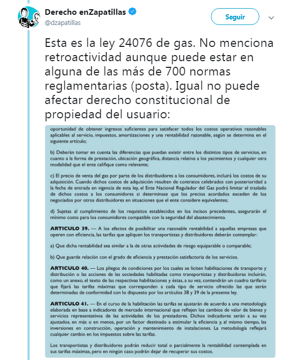 Además, el abogado subió en Twitter un fragmento de la ley 24.076 de gas: «No menciona retroactividad aunque puede estar en alguna de las más de 700 normas reglamentarias (posta). Igual no puede afectar derecho constitucional de propiedad del usuario».