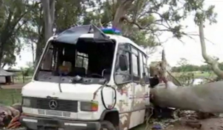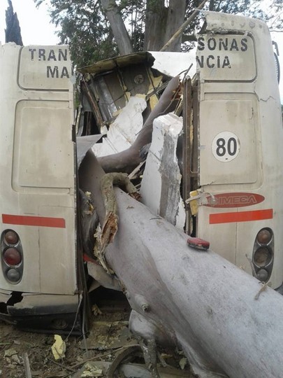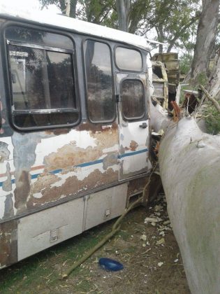 Un viejo eucalipto cayó sobre un micro que transportaba el personal de la Unidad Penal X de Santa Felícia y, literalmente, lo partió en dos.