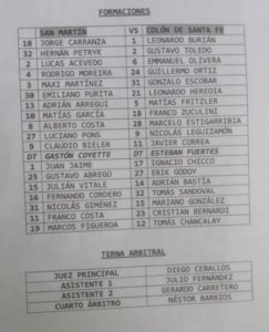 Colón: 1- Leonardo Burian/ 2- Gustavo Toledo, 6- Emanuel Olivera, 24- Guillermo Ortíz y 31- Gonzalo Escobar/ 21- Leonardo Heredia, 5- Matías Fritzler, 18- Franco Zuculini y 28- Marcelo Estigarribia/ 9- Nicolás Leguizamón y 11- Javier Correa. DT: Esteban Fuertes.