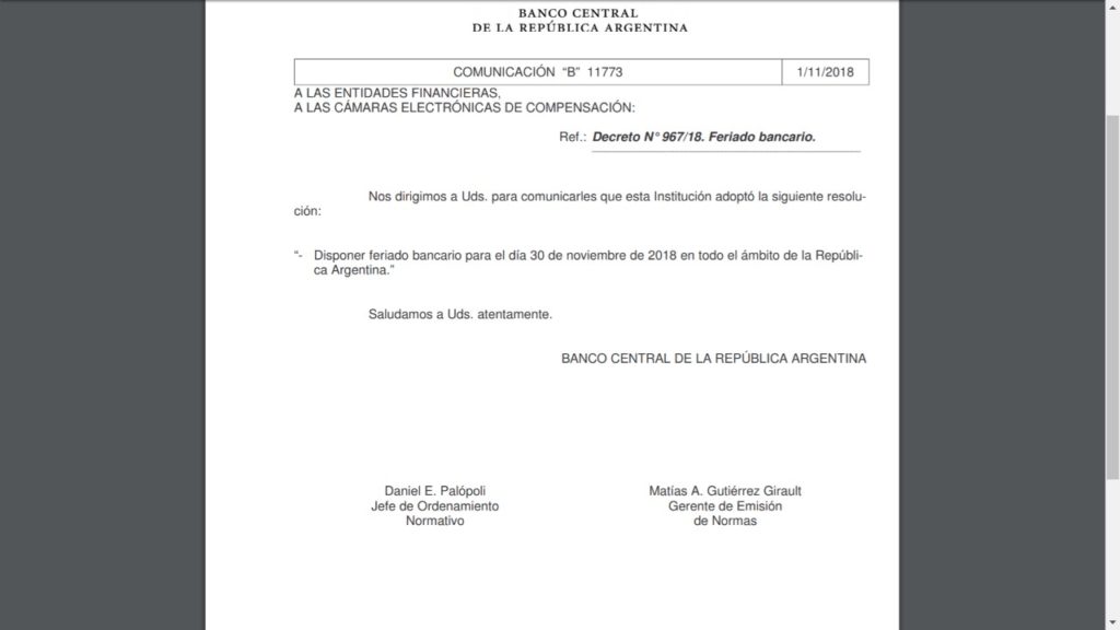 En este caso, la entidad rectora de todos los bancos, el Banco Central de la República Argentina oficializó una circular que confirma para el viernes 30 un feriado bancario a nivel Nación.