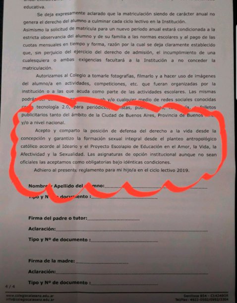 «Acepto y comparto la posición de defensa del derecho a la vida desde la concepción y garantizo la formación sexual integral desde el planteo antropológico y católico», dice el documento que los padres deben firmar a la hora de obtener la matrícula 2019 para la escuela católica Calasanz, del barrio porteño de Caballito.