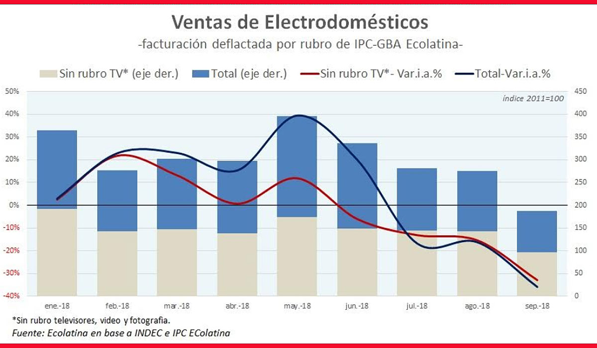 La consultora prevé que la caída en la venta de electrodomésticos se profundizará en el último trimestre de 2018 y que las mismas no mostrarán mejoras significativas durante 2019, debido a la dilación del crecimiento del salario en términos reales.