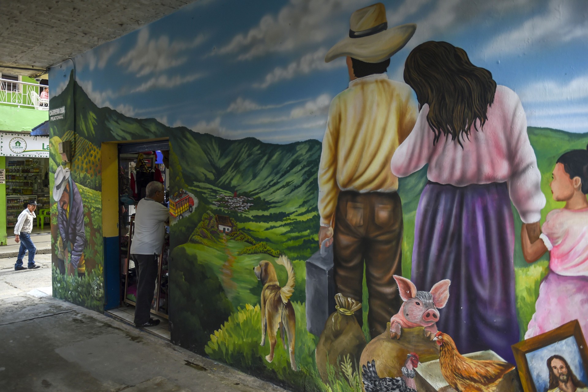 Un bebé camina junto a un mural durante el Primer Festival Internacional de Murales por la Paz en San Carlos, departamento de Antioquia, Colombia, el 21 de noviembre de 2018.