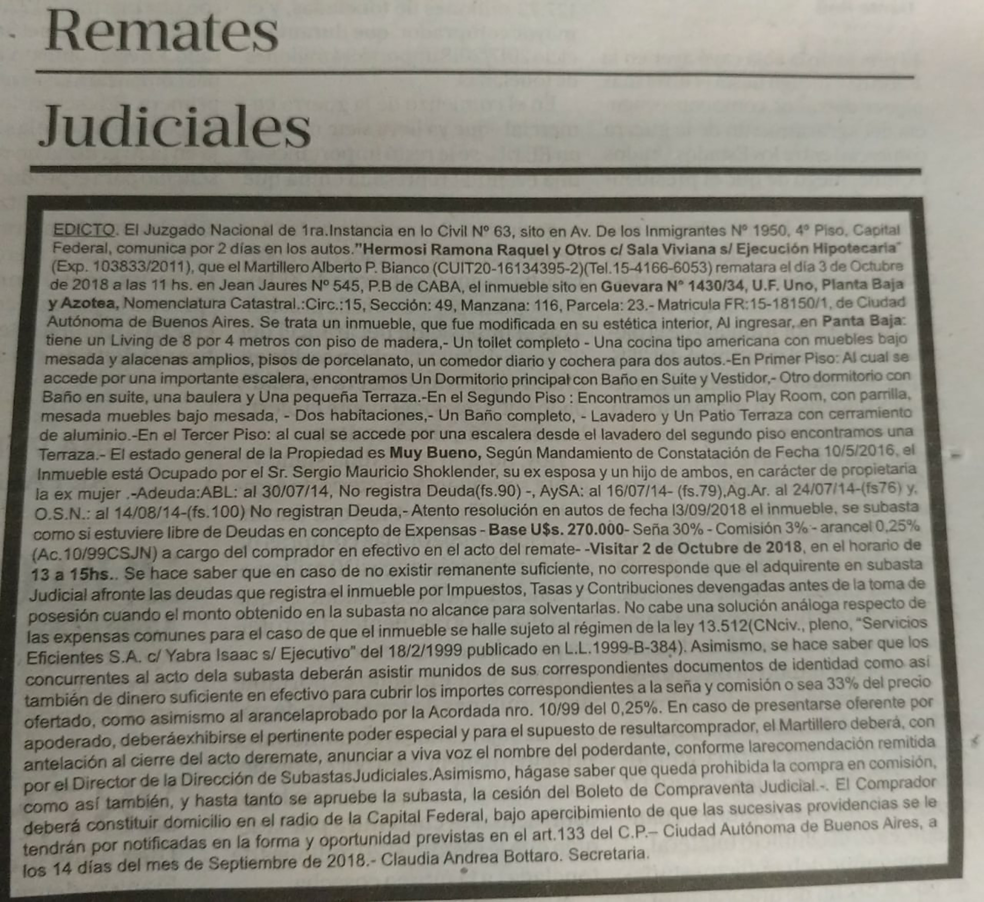 La casa de la calle Guevara fue adquirida por Schoklender y su entonces esposa antes de que comenzara el Plan Sueños Compartidos, pero como figura a nombre de Viviana Sala, que está siendo investigada y arrastra un llamado a indagatoria, el juez tiene previsto pedir, como medida cautelar, que el dinero de la subasta quede depositado en una cuenta bancaria.
