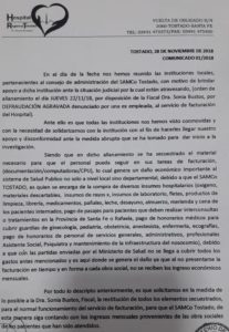 En el día de la fecha (28 de noviembre de 2018) nos hemos reunido las instituciones locales, pertenecientes al consejo de administración del Samco Tostado, con motivo de brindar apoyo a dicha institución ante la situación judicial por la cual están atravesando (orden de allanamiento el día jueves 22 de noviembre de 2018 por disposición de la fiscal Dra. Sonia Bustos, por defraudación agravada denunciado por una ex empleada al servicio de facturación del hospital).