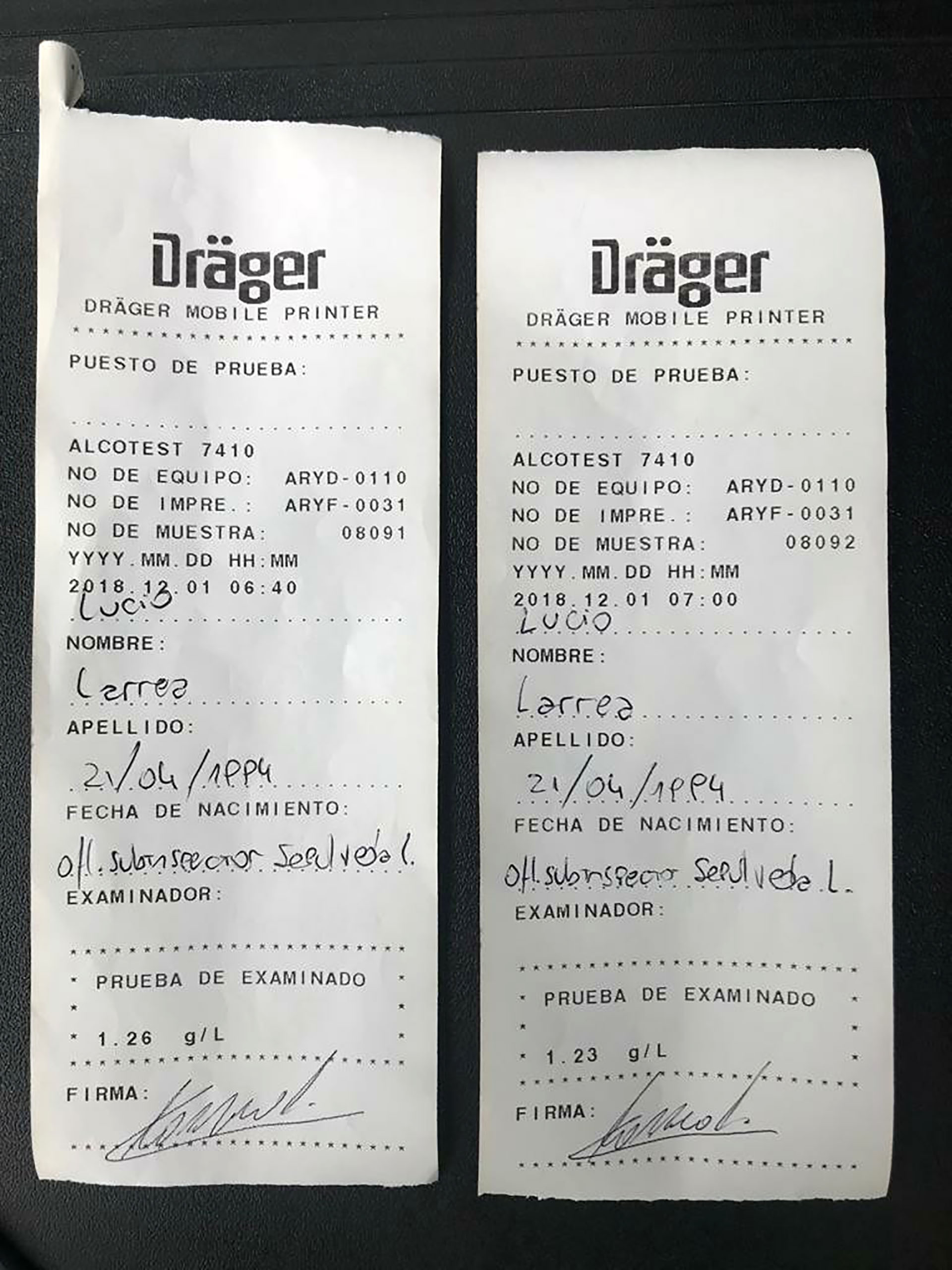 Sin embargo, no conforme con esto, el oficial Larrea siguió protestando. Por esa razón se le realizó una segunda prueba a los veinte minutos, esto es, a las 07:00 según quedó impreso en el segundo talón. ¿El valor? 1,23 gramos por litro.