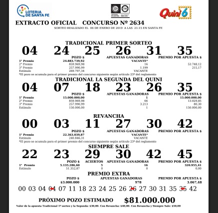 Fue el único ganador destacado del sorteo del Quini de este domingo 6 de enero, ya que el pozo tradicional, revancha y siempre sale no tuvieron apostadores que hayan acertado los seis números.