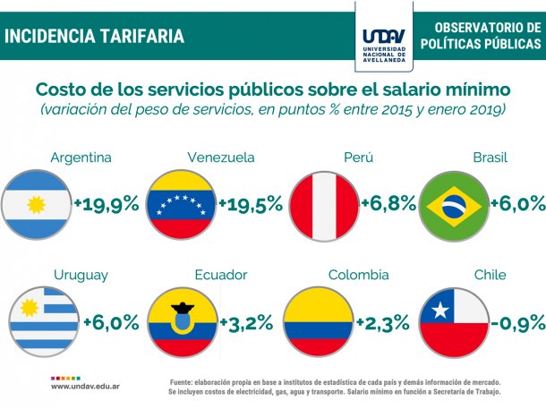 Argentina fue el país en que más subieron los servicios públicos de toda América del Sur desde enero de 2015 al mismo mes de 2019: un total de 19,9%, de acuerdo con el salario mínimo que perciben sus pobladores. Le sigue Venezuela con el 19,5% y más lejos Perú y Brasil y Uruguay,que registraron un aumento de 6,8 y 6,0%, respectivamente, en el mismo periodo.