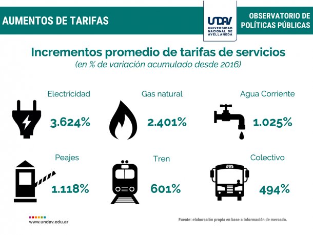 Desde inicios de 2016, argentina tuvo incrementos acumulados promedio del 3.624% en energía eléctrica, de 2.401% en gas natural, y de 1.025% en agua potable de red. En tanto, el transporte aumentó el 1.118% en peajes, 601% en el boleto del tren, 494% en colectivos de corta distancia y un 322% en subtes, -también en terminos de aumento acumulado-.