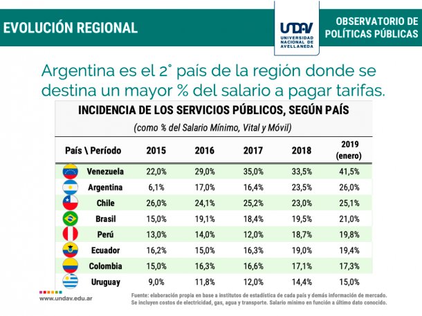 Desde la asunción de Cambiemos en 2015, se pasó de una incidencia muy baja del costo tarifario en el salario mínimo de los argentinos, cercana al 6,1%, a una de 26%. Argentinapasó a la segunda posición en el ranking de los servicios públicos más caros de la región. Los aumentos desde 2016 hasta la fecha, nos posiciona sólo por detrás de Venezuela (41,5%).