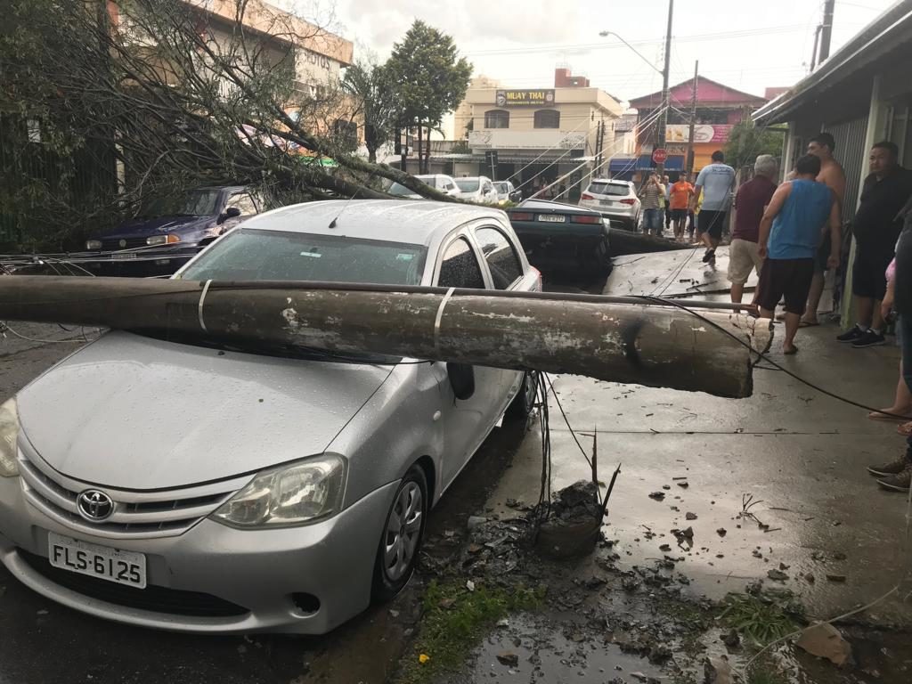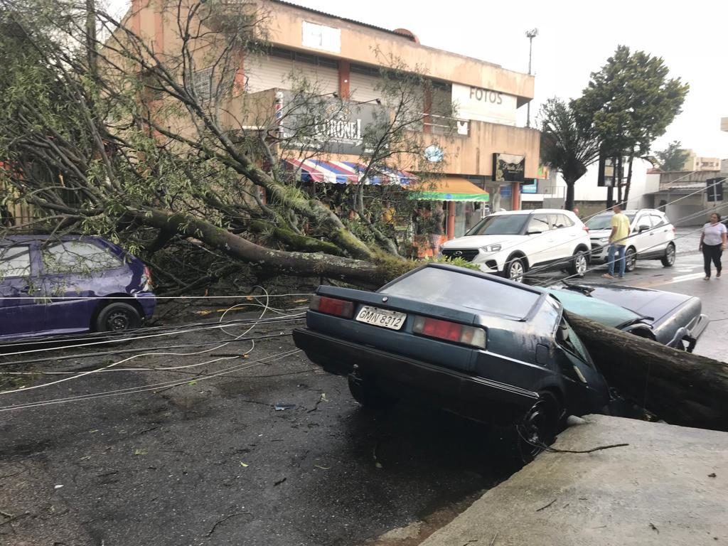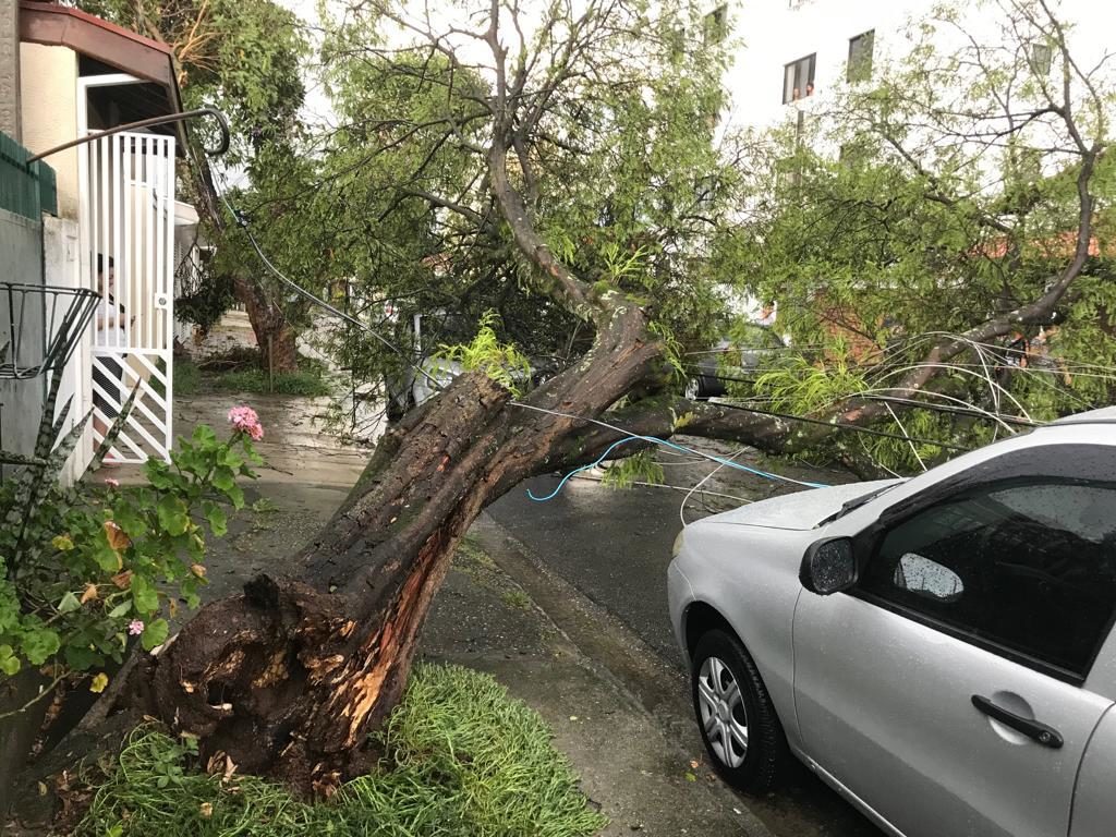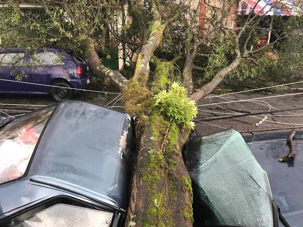 Según los registros gráficos que se pueden ver en las imágenes, el fuerte viento arrancó de cuajo añosos árboles que cayeron sobre vehículos en la zona céntrica de la ciudad, donde también se produjeron voladuras de techos, caída de árboles y una fuerte lluvia.