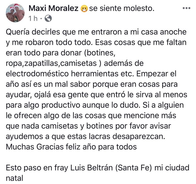 Maximiliano Moralez no tuvo un buen arranque de 2019 y en las últimas horas fue víctima de un triste episodio de inseguridad. En medio de las vacaciones, ladrones ingresaron a su casa de Fray Luis Beltrán, su ciudad natal ubicada en la provincia de Santa Fe, y se la desvalijaron.