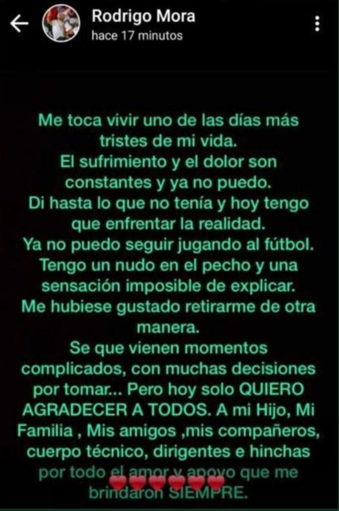 Rodrigo Mora anunció su retiro en su estado de Whats app.
