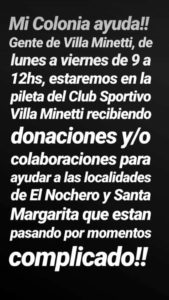 En este sentido, en Villa Minetti se reciben donaciones en la pileta del club Sportivo, de lunes a viernes en el horario de 9 a 12, a partir de una iniciativa de los miembros de la Colonia de Vacaciones.