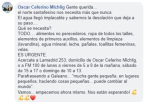 En Ceres también se puso en marcha una campaña por el norte del departamento 9 de Julio. Las donaciones pueden acercarse al domicilio de Oscar Ceferino Michlig, en Lamadrid 253, o en la radio FM 100, de lunes a viernes de 5 a 8, sábados de 15 a 17 o domingos de 10 a 13.