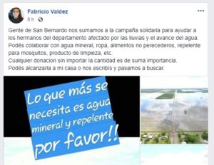 Por su parte, San Bernardo recolecta agua mineral, ropa, alimentos no perecederos, repelente para mosquitos, productos de limpieza, entre otros elementos. Los mismos pueden ser alcanzados a la casa de Fabricio Valdéz, representante local del Movimiento Evita, a quien también se puede contactar a través de la red social Facebook.