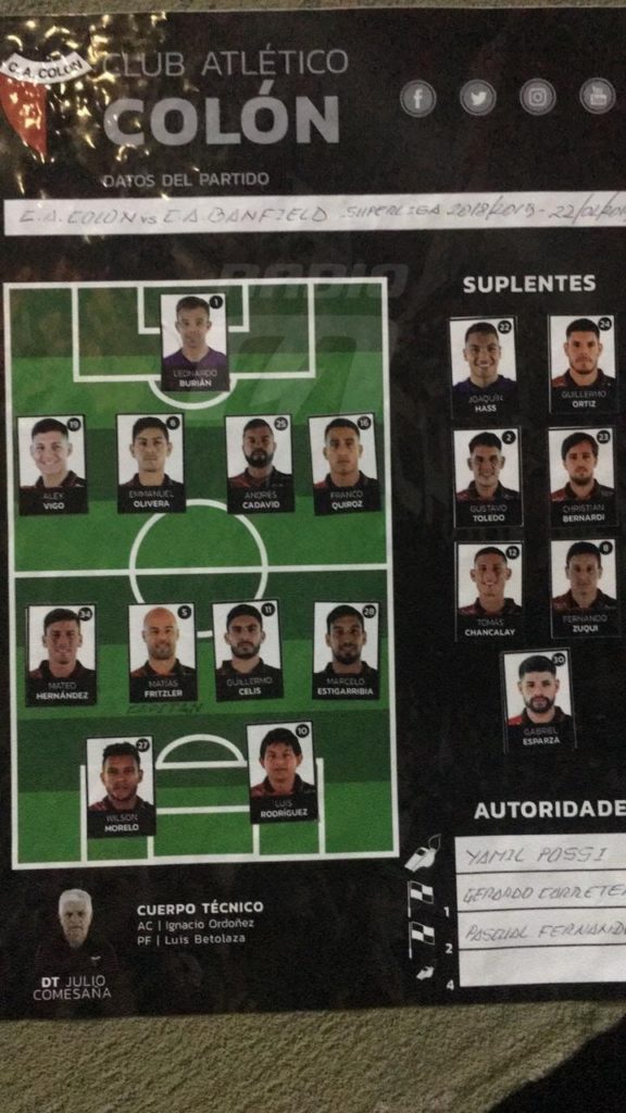 Colón: 1- Leonardo Burian/ 19- Alex Vigo, 6- Emanuel Olivera, 25- Andrés Cadavid y 16- Franco Quiroz/ 34- Mateo Hernández, 5- Matías Fritzler, 11- Guillermo Celis y 28- Marcelo Estigarribia/ 10- Luis Miguel Rodríguez y 27- Wilson Morelo. DT: Julio Comesaña.