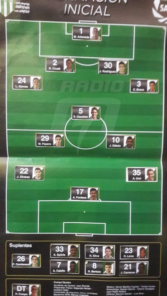 Banfield: 1- Mauricio Arboleda/ 24- Luciano Gómez, 2- Renato Civelli, 30- Jorge Rodríguez y 3- Nicolás Claudio Bravo/ 5- Emanuel Cecchini/ 22- Juan Pablo Álvarez, 29- Martín Payero, 10- Jesús Dátolo y 35- Agustín Urzi/ 17- Agustín Fontana. DT: Hernán Crespo.