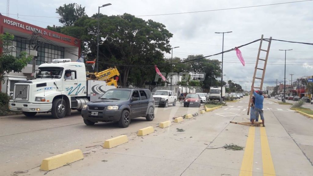 Luego de la tormenta, los cables se «aflojaron» y quedaron más bajos impidiendo el paso de los vehículos de gran porte. Para evitar un inconveniente en el tránsito, los cuidacoches usaron una escalera como parante para levantar el cable de energía eléctrica.