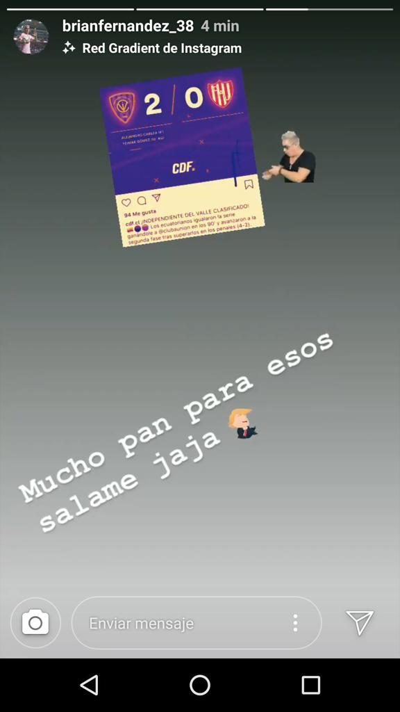 Al segundo de conocerse la eliminación de Unión, Brian Fernández subió en su red social una foto del resultado y escribió “mucho pan para esos salames”.