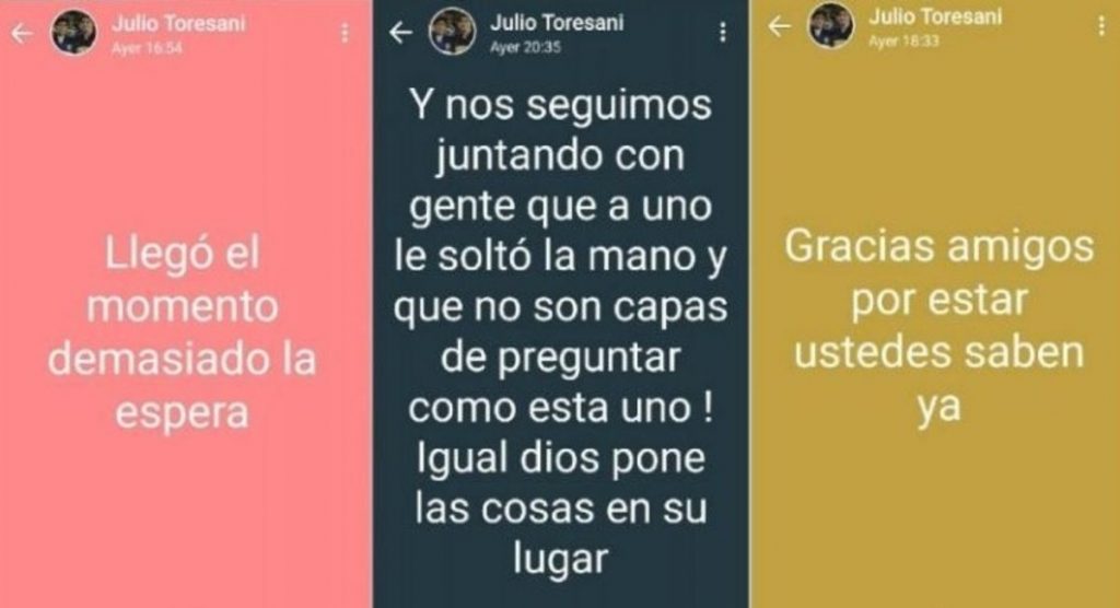 Julio «Huevo» Toresani ennvió un estado de Whatsapp en la tarde del domingo 21 de abril. El mensaje tiene como horario las 16.54.
