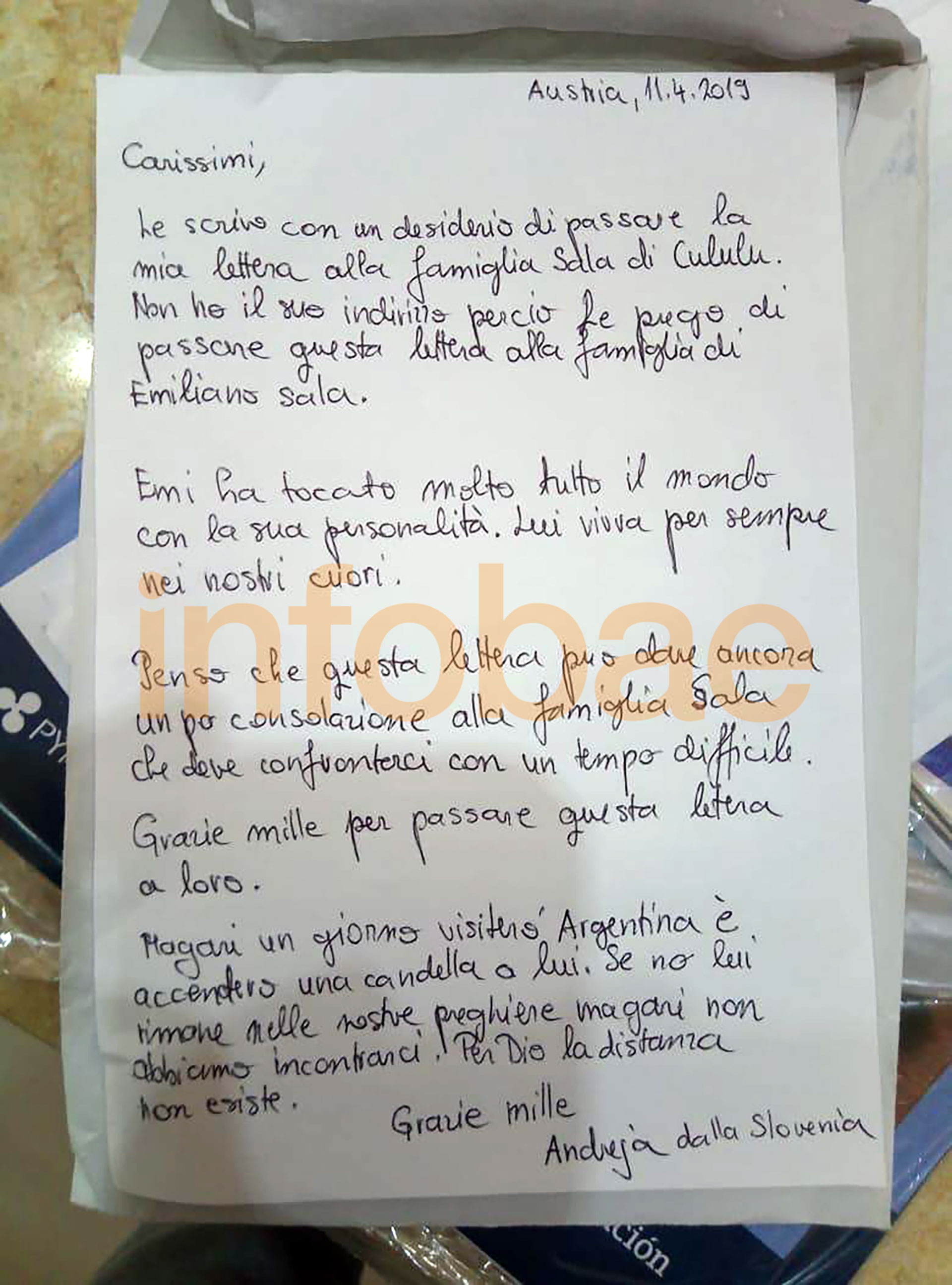 Escribo con el deseo de que esta carta llegue a la familia de Sala en Cululú. No tengo su dirección, por eso les pido que envíen esta carta a la familia de Emiliano Sala.