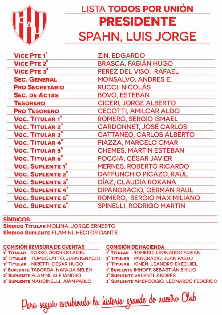Entre sus integrantes, la figura más destacada es la de Jorge Molina, actual titular de UPCN, y candidato a ser el Sindico Titular de la institución rojiblanca. Hacía tiempo que no se lo veía interesado al representante gremialista en integrar la vida institucional de Unión. La causa era que ya no tendría relación con el actual presidente rojiblanco. Pero al parecer el vinculo se reconstruyó con esta nueva propuesta.