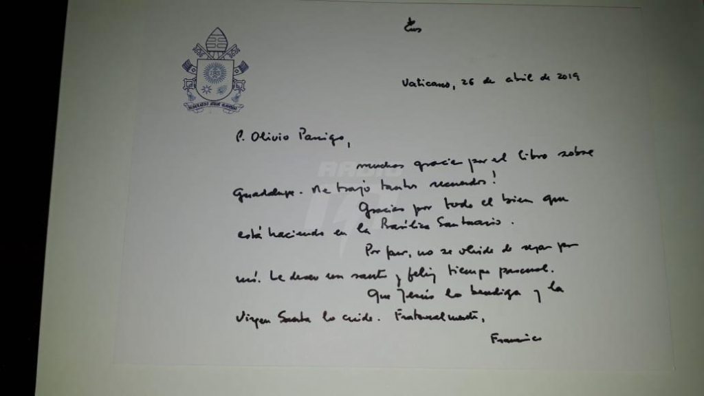 A través de Monseñor Sergio Fenoy, el padre Olidio Panigo, párroco de la Basílica de Guadalupe, le hizo llegar a Francisco un ejemplar de su obra: “Guadalupe, Imágenes de la Fe”, que cuenta la historia de la Basílica de Guadalupe y que fue publicado en 2018, con motivo de celebrarse los 100 años de la creación de la Parroquia.